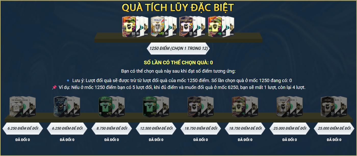 Lưu ý: Nếu các HLV sử dụng hết số lượt đổi quà, sẽ không thể nhận hoặc đổi các phần quà tại mốc 1250 điểm (bao gồm cả QUÀ TÍCH LŨY ĐẶC BIỆT)