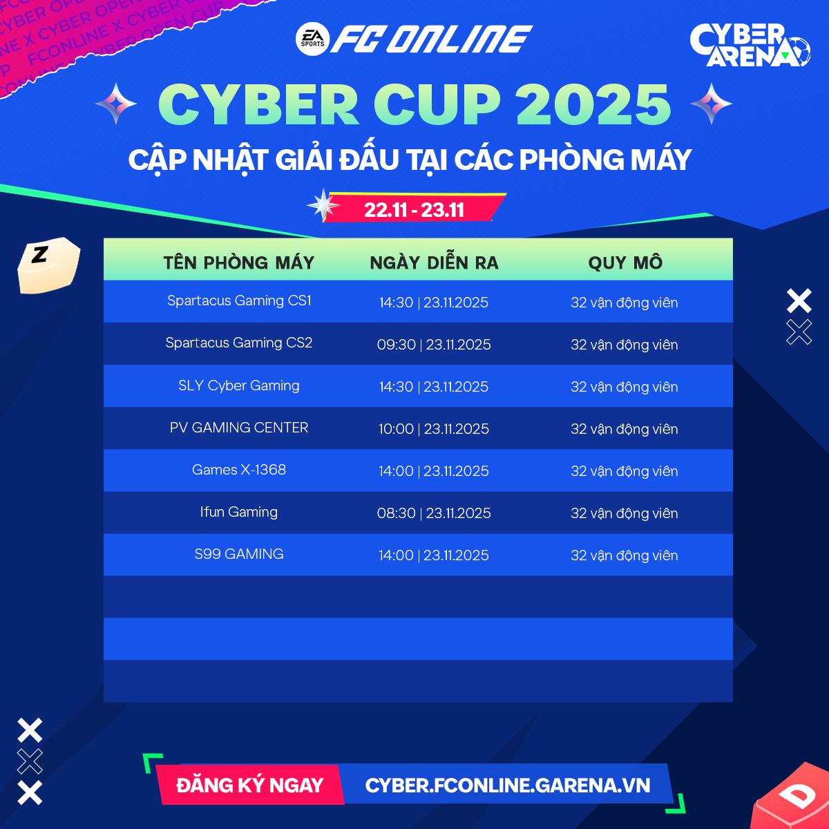 Các phòng máy đối tác của FC Online trên khắp tỉnh thành đã chính thức khởi tranh các giải đấu từ ngày 22.11 và 23.11, các HLV đã có thể đăng ký tham gia trên trang sự kiện Cyber Arena.
