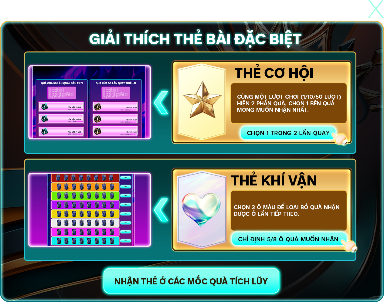 - Thẻ cơ hội: Cùng một lượt chơi (1/10/50 lượt) hiện 2 phần quà, chọn 1 bên quà mà các HLV mong muốn nhận nhất (Chọn 1 trong 2 lần quay)