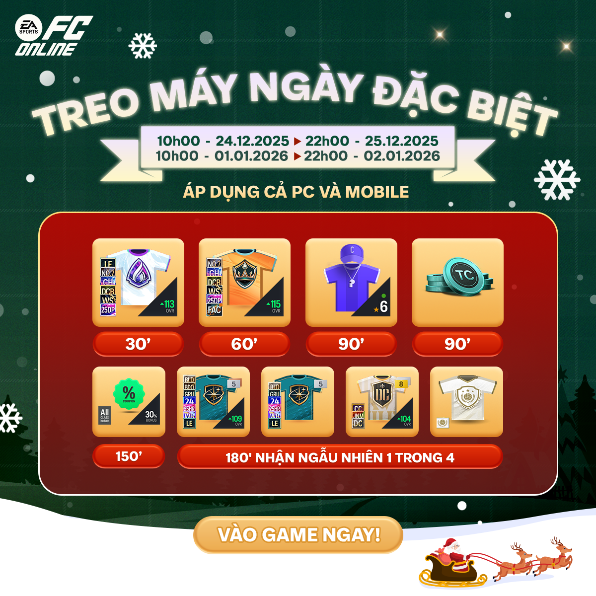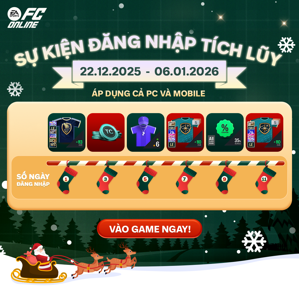 Mùa lễ hội cuối năm đã tràn về khắp các sân cỏ của FC Online! Để hòa cùng bầu không khí rộn ràng của Giáng Sinh và chuẩn bị chào đón năm mới 2025 rực rỡ, FC Online gửi đến các HLV chuỗi sự kiện ingame từ 22.12.2025 – 06.01.2026 vô cùng đặc biệt với 3 hoạt động chính: