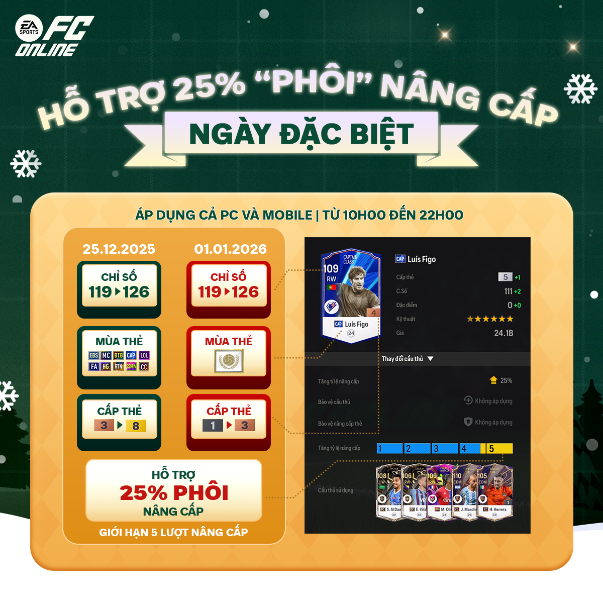 Sự kiện mong đợi nhất cho các HLV mong muốn nâng cấp đội hình của mình nhưng vẫn tiết kiệm phôi, tăng tỉ lệ thành công cực cao. Vào 2 ngày đặc biệt, FC Online sẽ hỗ trợ 25% phôi cho 5 lượt nâng cấp cầu thủ với các điều kiện sau: