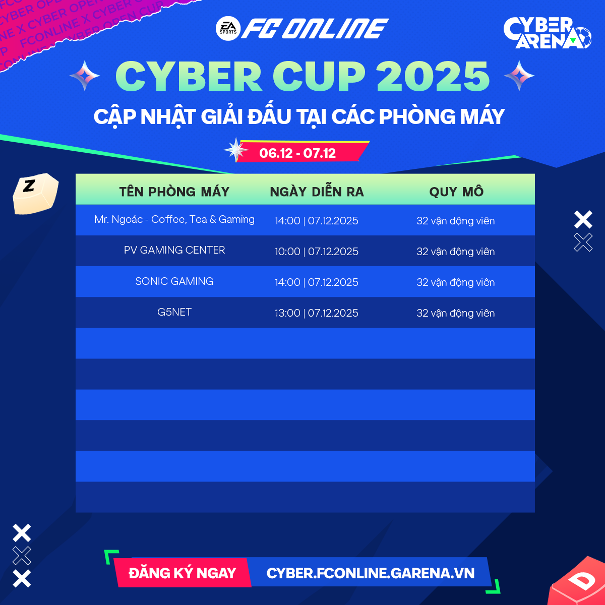 Các phòng máy đối tác của FC Online trên khắp tỉnh thành đã chính thức khởi tranh các giải đấu từ ngày 06.12 và 07.12, các HLV đã có thể đăng ký tham gia trên trang sự kiện Cyber Arena.