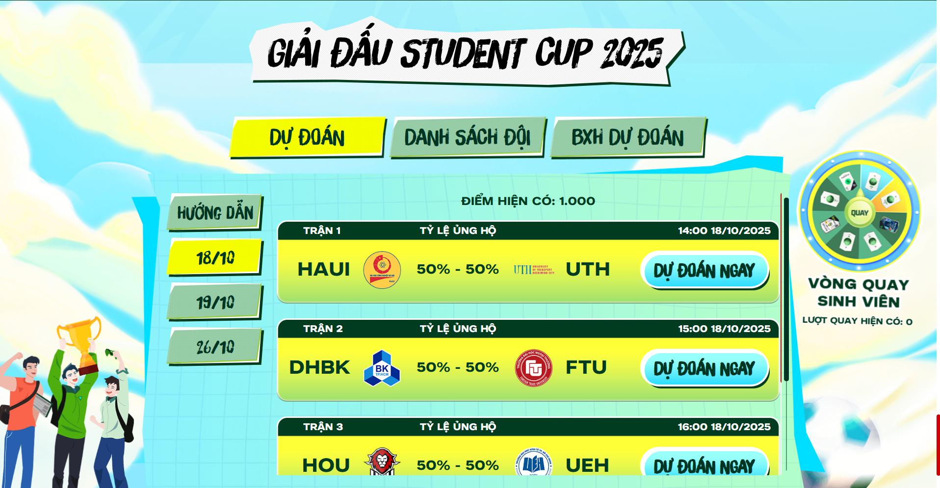 - Nếu người tham gia là sinh viên của một trong các trường (đã xác thực trạng thái sinh viên trên trang) và tham gia dự đoán kết quả cho tất cả các đội trường trong vòng đấu, người đó sẽ được cộng thêm 0.1 vào hệ số điểm dự đoán.