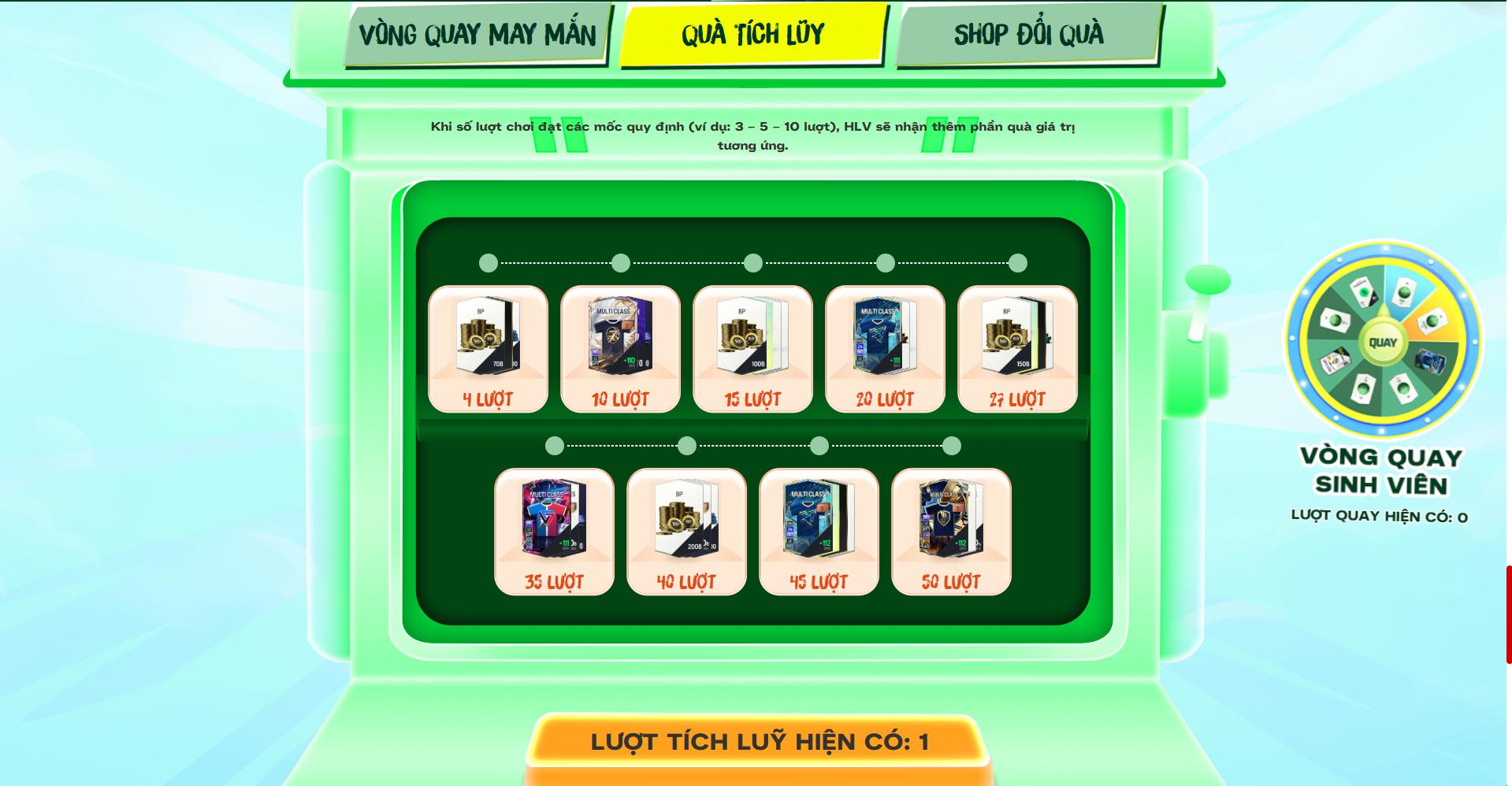 Ngoài các phần quà nhận được khi chơi vòng quay may mắn, các HLV sẽ nhận được thêm nhiều phần quà tích lũy hấp dẫn khác tương ứng với số lượt sút bóng đã tích lũy được.