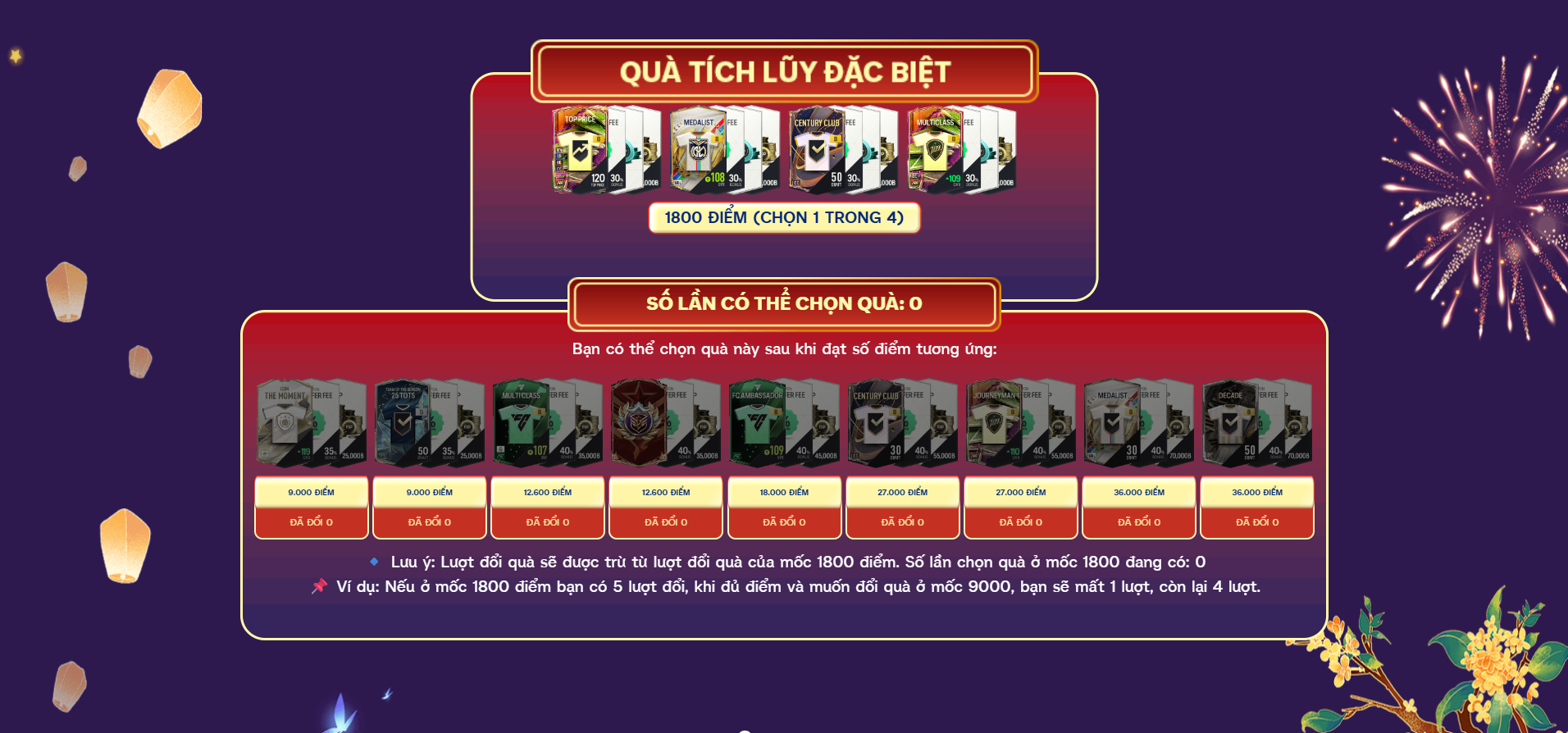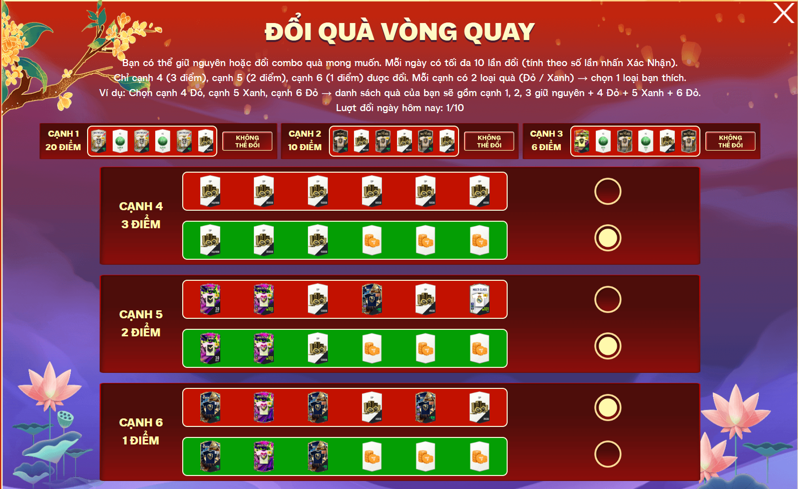 Ví dụ: Trong trường hợp tất cả các mặt điểm chưa từng được thay đổi. HLV đã cảm thấy ưng ý với mặt lồng đèn 3 điểm hiện tại, nhưng muốn thay đổi mặt lồng đèn 2 điểm và 1 điểm thì lựa chọn thay đổi nhóm quà như sau: