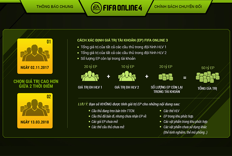 Trước đây, chúng tôi đã thông báo rằng: Toàn bộ giá trị tài khoản (gồm tổng giá trị của tất cả các cầu thủ bạn sở hữu trong 2 HLV và EP trắng) mà bạn sở hữu trong FO3 sẽ được quy đổi hoàn toàn sang một loại điểm đặc biệt gọi là EP point.