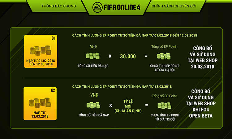 Tổng số tiền bạn đã nạp vào FIFA Online 3 từ ngày 01.02.2018 đến ngày 12.03.2018 sẽ được quy đổi thẳng sang EP Point khi Web Shop ra mắt (20.03.2018).