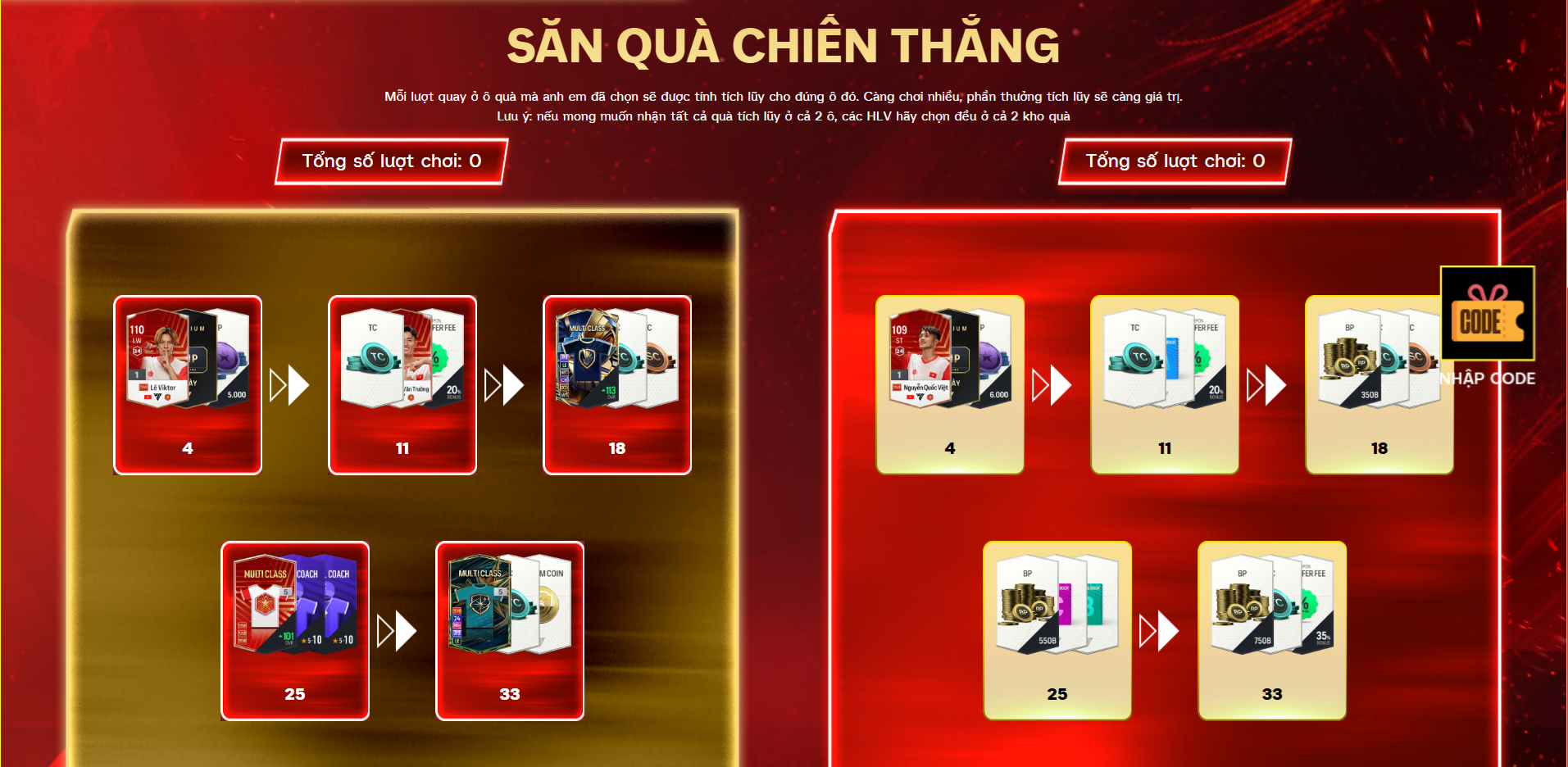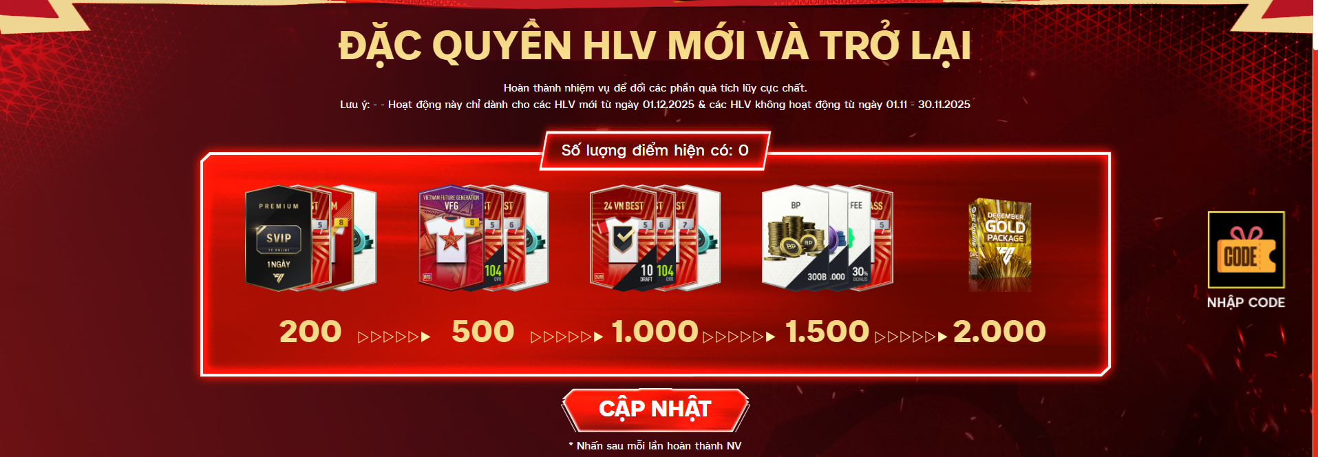 Ngay khi tham gia sự kiện, các HLV mới và HLV quay trở lại sẽ được mở khóa chuỗi nhiệm vụ đặc biệt. Chỉ cần hoàn thành những yêu cầu đơn giản mỗi ngày, anh em đã có thể nhận ngay sổ huấn luyện, phiếu giảm giá thuế các mùa cùng dàn cầu thủ Việt Nam hoàn toàn miễn phí – quá hấp dẫn để bắt đầu mùa giải mới đầy bùng nổ.